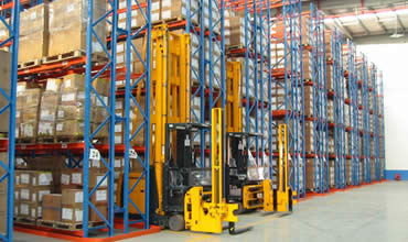 此類倉(cāng)庫(kù)中,低、高位倉(cāng)庫(kù)大多用前移式電瓶叉車、平衡重電瓶叉車、三向叉車進(jìn)行存取作業(yè),貨架較矮時(shí)也可用電動(dòng)堆高機(jī),超高位倉(cāng)庫(kù)用堆垛機(jī)進(jìn)行存取作